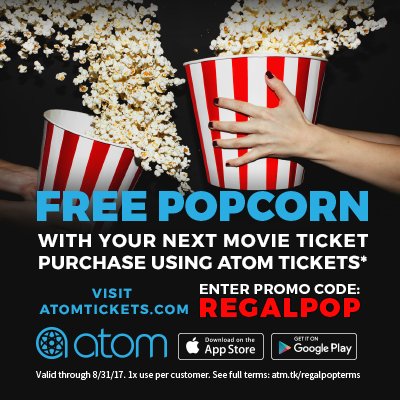 Atom Tickets Coupon Codes 22 (50% discount) - Oct Promo Codes Save up to 50% with these current Atom Tickets coupons for October 2022. The latest atomtickets.com coupon codes at CouponFollow. Regal Cinemas Coupons: Get a $3 Discount, 4 October Promo Codes. Save with Regal Cinemas Coupons and deals. Get Discounts on movie tickets, concessions and more. Today's top deal: $3 Off Popcorn & Soft Drink With AARP Card. Disney Movie Insiders DOWNLOAD THE APP. EARN 25 POINTS, ON US. Scan movie tickets & enter codes to earn points. Redeem the latest rewards on-the-go. Play exciting interactive experiences – now available in the app!